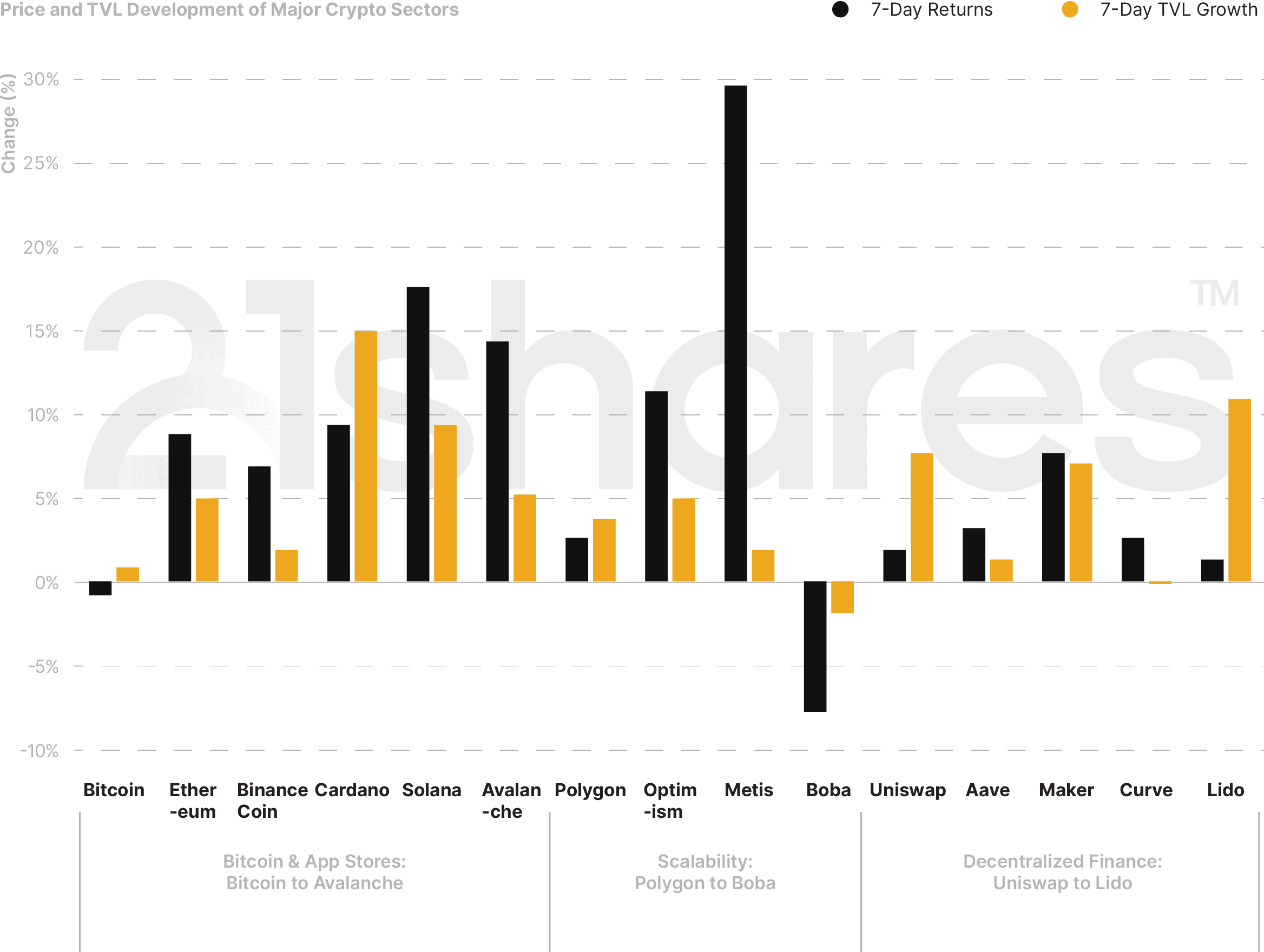 In a week marked by mixed news, the crypto market experienced relatively sideways movement, with a few notable exceptions. While inflation came in lower than anticipated, U.S. banks exceeded earnings expectations, leaving the Federal Reserve's response in their upcoming May meeting uncertain. Bitcoin remained relatively stable this week, while Ethereum surged nearly 10% following the successful Shapella upgrade. On the same news, Lido, a staking provider, witnessed an increase in TVL of more than 10%. Among the top performers were Solana, which saw a significant uptick with the announcement of their smartphone, SAGA, and Arbitrum in the scalability sector, boasting an impressive 30% growth.**