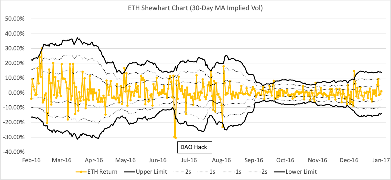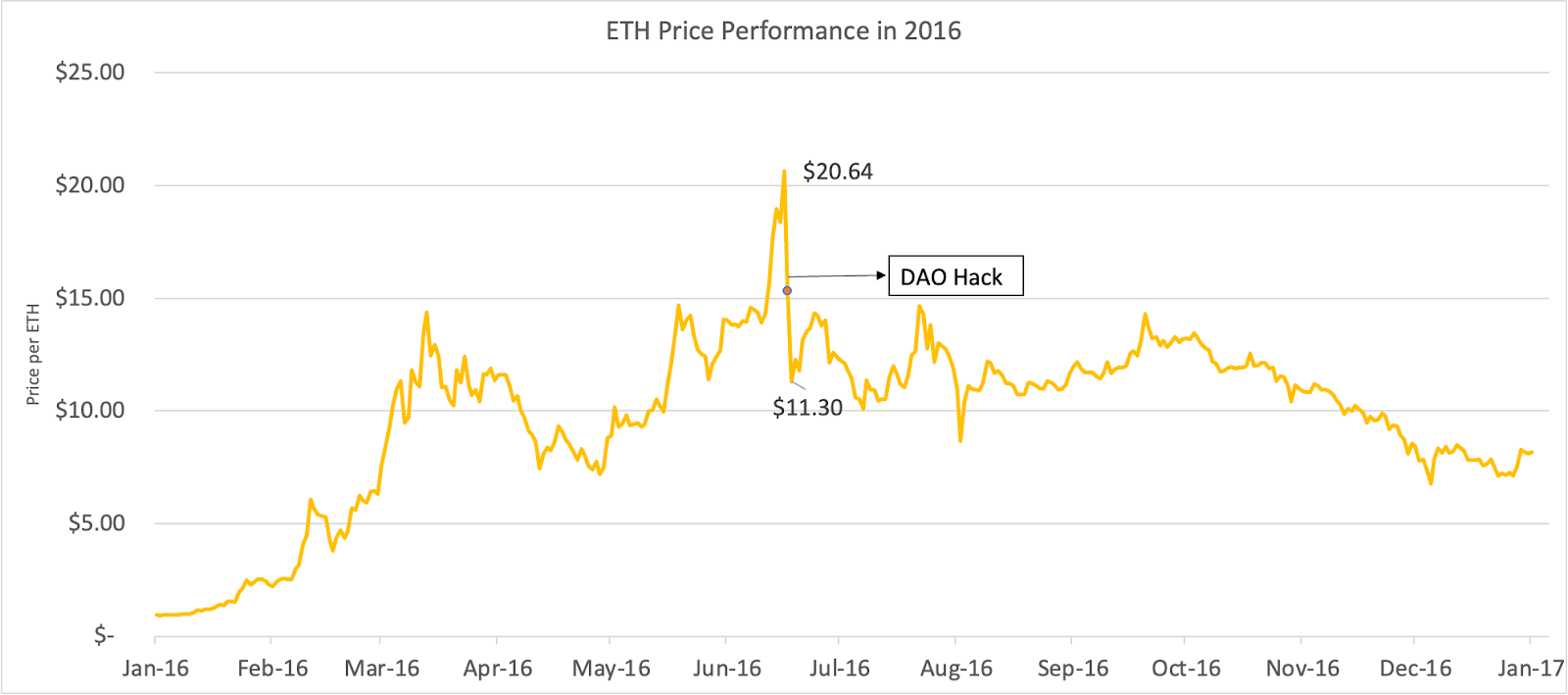 - Miners want to keep the Proof-of-Work system and initiate a network bifurcation away from Proof-of-Stake, also called a fork: The risks of a fork are significant, as stakeholders, such as Ethereum applications, must choose which blockchain they will support. Hard forks have historically hurt the price of the native currency of the resulting blockchains as people worry about the consequences of a divided community. For instance, in July 2016, a hard fork took place on the Ethereum blockchain due to the DAO hack, giving birth to Ethereum Classic. In the two days following the DAO hack, there were two moves above three sigma (standard deviations from the mean), representing an almost 50% decrease in price from $20.64 before the hack to $11.30. For the rest of 2016, ETH's price didn't recover and closed the year at $8.09, down 61% from its all-time high price before the DAO hack and subsequent hard fork. Notwithstanding, history may not repeat itself as circumstances are very different today.