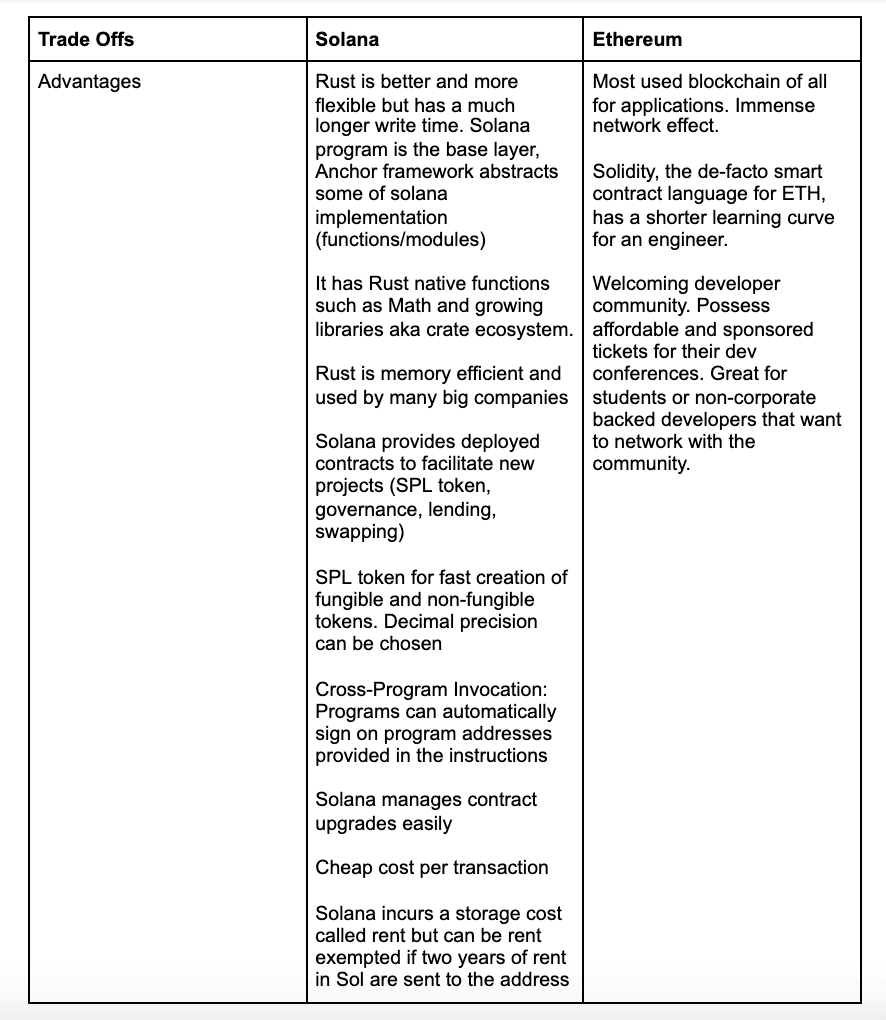 This section will help you understand the major trade offs to build on Solana compared with Ethereum as the latter is the most dominant developer platform. Our engineering team gave their technical insights into Solana as a smart contract platform serving as an indication to the current state of Solana when it comes to building a vibrant and sticky developer community.