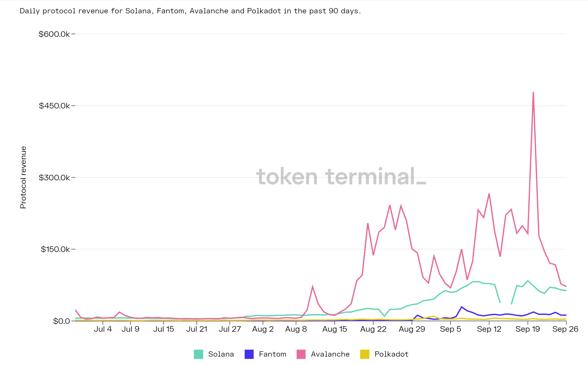 Revenue generation is often a key metric when assessing network value. By assessing the total number of transactions and the average cost per transaction we are able to estimate the total revenue generated. Fees are a good signal for the overall demand for a given smart contract platform and arguably the strongest barometer of fundamental growth. Solana’s 30 billion transactions with the average cost of $0.00025 gives an estimated revenue of $7.5 million since the launch of the mainet in March 2020. Ethereum’s annualized revenue stands at $13.32 billion.