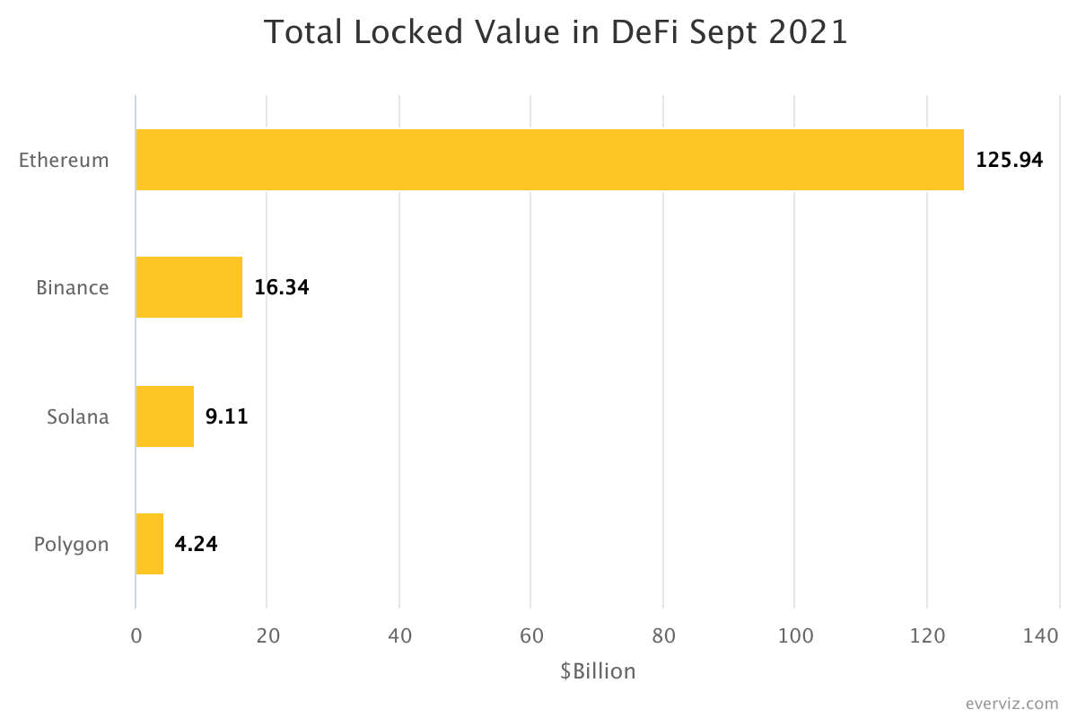 This section compares the current Total-Value-Locked (TVL) of Solana relative to other major networks such as Ethereum, Binance, Terra, Polygon and Bitcoin. TVL can be a useful tool to compare network utilization and a method to measure the flow of capital within DeFi.