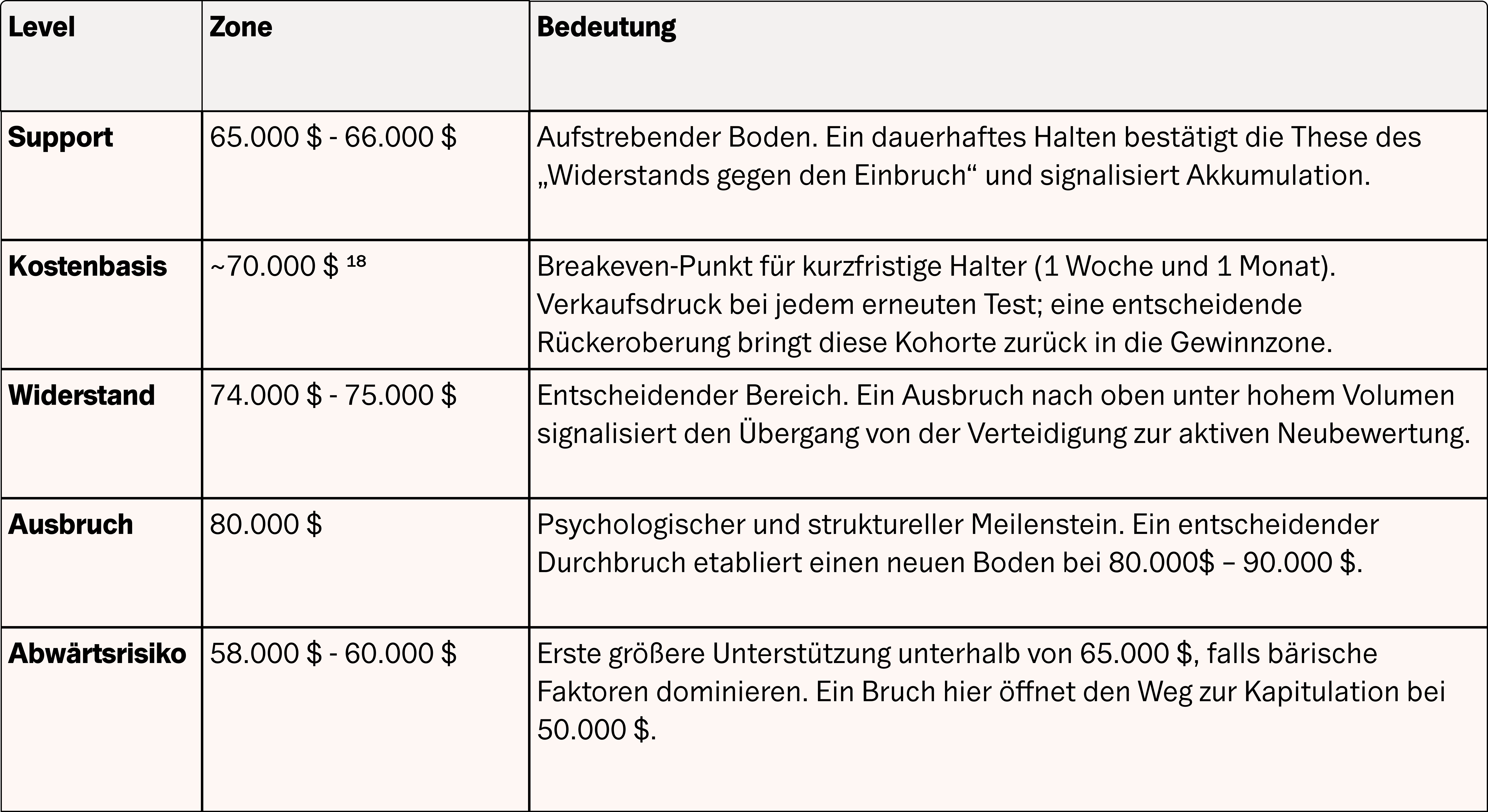 Ein nachhaltiger Durchbruch über 75.000 US-Dollar unter hohem Volumen würde darauf hindeuten, dass sich ein dauerhaft bullisches Umfeld etabliert. Die nächsten Ziele liegen im Bereich von 80.000 bis 90.000 US-Dollar, wobei potenzielle Katalysatoren eine Zinssenkungswahrscheinlichkeit von über 40 % im Juli oder Fortschritte beim „Clarity Act“ im ersten Halbjahr 2026 sein könnten. Sollten umgekehrt negative Faktoren überwiegen und wir unter 65.000 US-Dollar fallen, weiten sich die Risiken in Richtung 58.000 bis 60.000 US-Dollar und potenziell bis zur Kapitulationszone bei 50.000 US-Dollar aus.