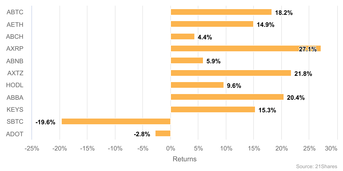 The performance of our line of ETPs over the last 30 days is as follows: ABTC (18.2%), AETH (14.9%), ABCH (4.4%), AXRP (27.1%), ABNB (5.9%), AXTZ (21.8%), HODL (9.6%), ABBA (20.4%), KEYS (15.3%), SBTC (-19.6%), and ADOT (-2.8%).