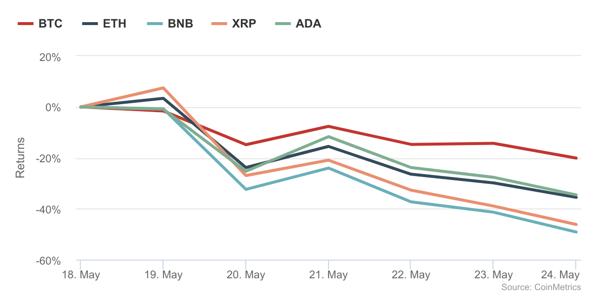 The returns of the top six crypto assets over the last week were as follows — BTC (-20.10%), ETH (-35.52%), BNB (-49.15%), XRP (-46.18%), and ADA (-34.56%).