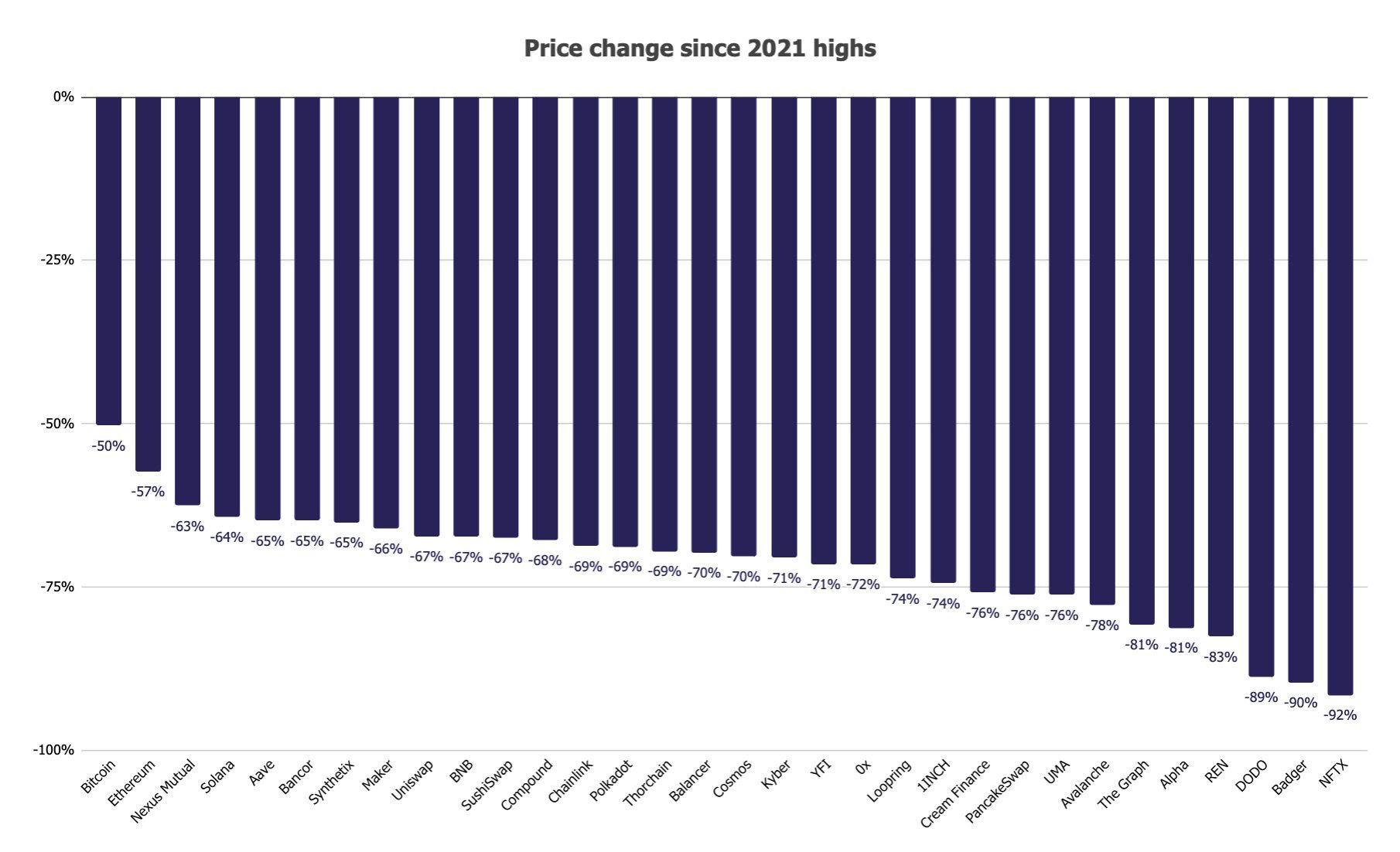 In the same vein, volatility spiked across assets. DVOL (the Deribit Implied Volatility Index) serving as a great volatility indicator or the fear gauge, unexpectedly soared. DVOL is the VIX of the bitcoin market that measures implied or expected volatility based on Bitcoin's options traded on Deribit, the largest options exchange. This panic selling also affected the long tail of cryptoassets, most of which dropped by more than 50% from their respective all-time high and hence wiped out hundreds of billions of dollars in total market value.