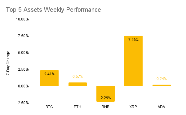 The returns of the top five crypto assets over the last week were as follows — BTC (2.41%), ETH (0.57%), BNB (-2.29%), XRP (7.56%), and ADA (0.24%).