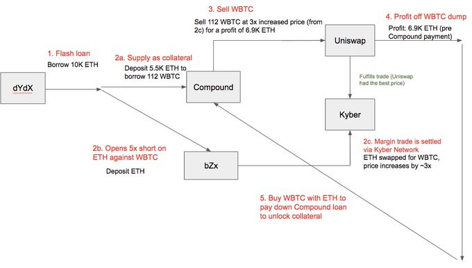 The diagram (Source: Jason Choi) below shows the steps that the manipulator used to carry out. the attack which made the use of several DeFi platforms including dYdX, bZx, Compound, Uniswap, and Kyber. Key to the manipulation was the use of a "flash loan" which allowed the manipulator to carry out the whole process within a single transaction on the Ethereum blockchain. Flash loans are unique as they have no collateralization requirements, therefore the attacker was able to pull off the scheme without any upfront capital.