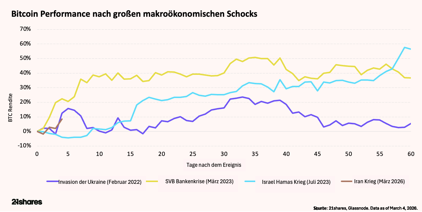 Das strukturelle Argument festigt sich: Geopolitische Schocks haben bei Bitcoin konsistent zu scharfen Drawdowns geführt, auf die schnelle Erholungen folgten: