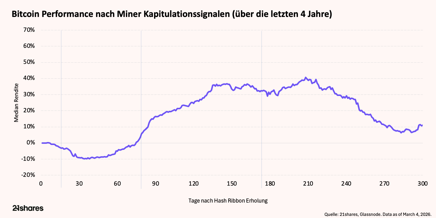 Das Miner-Capitulation-Szenario nähert sich seinem Ende: Der Hash-Ribbon-Indikator nähert sich nach fast drei Monaten der Kapitulation einem Erholungssignal. In den letzten vier Jahren folgten auf ähnliche Signale im Median Bitcoin-Renditen von etwa 16 % über drei Monate, 32 % über sechs Monate und fast 60 % über das darauffolgende Jahr. Das Signal markiert nicht zwangsläufig den exakten Boden, trat aber historisch gesehen in Phasen auf, in denen der Verkaufsdruck der Miner weitgehend erschöpft war und Akkumulationsphasen begannen.
