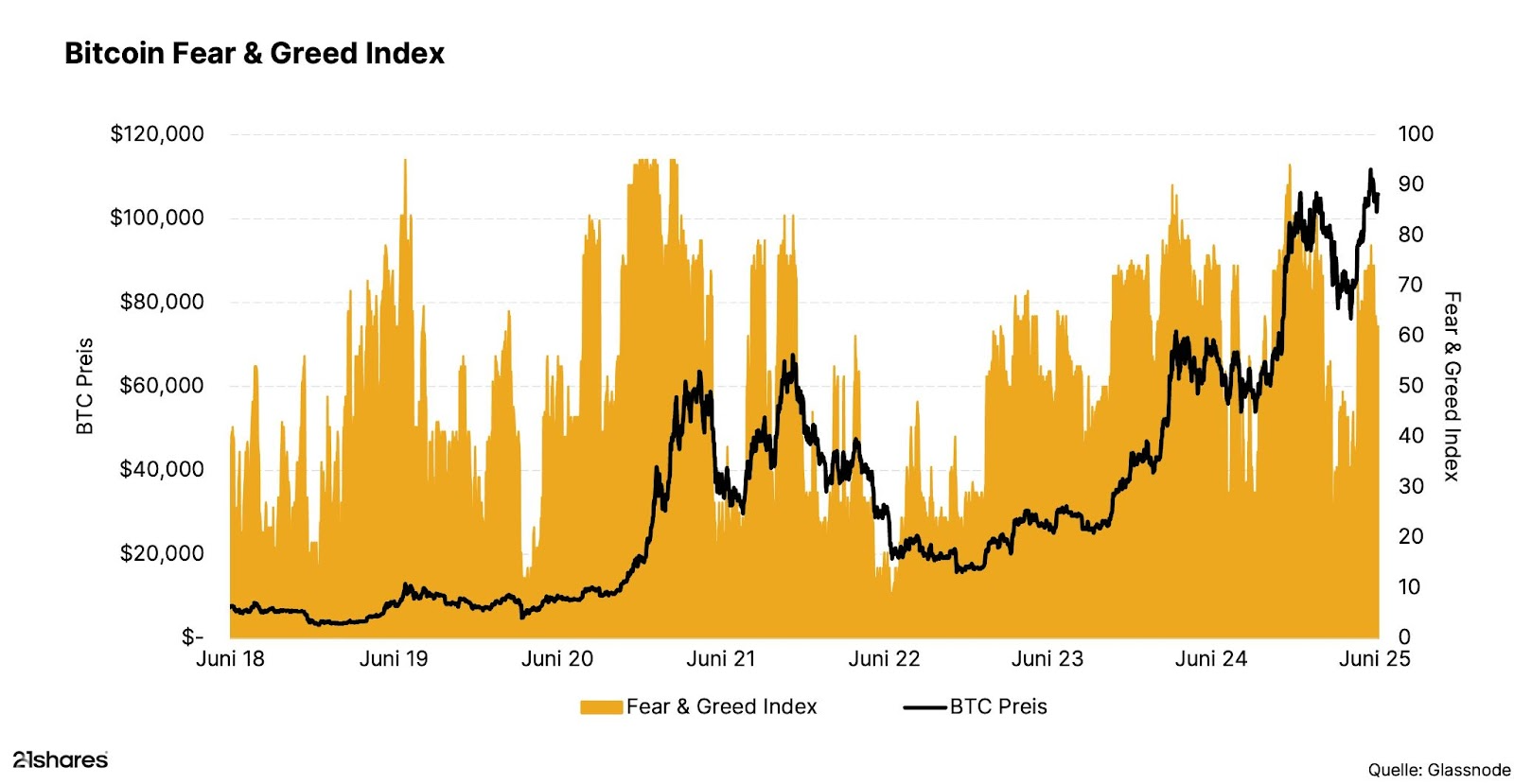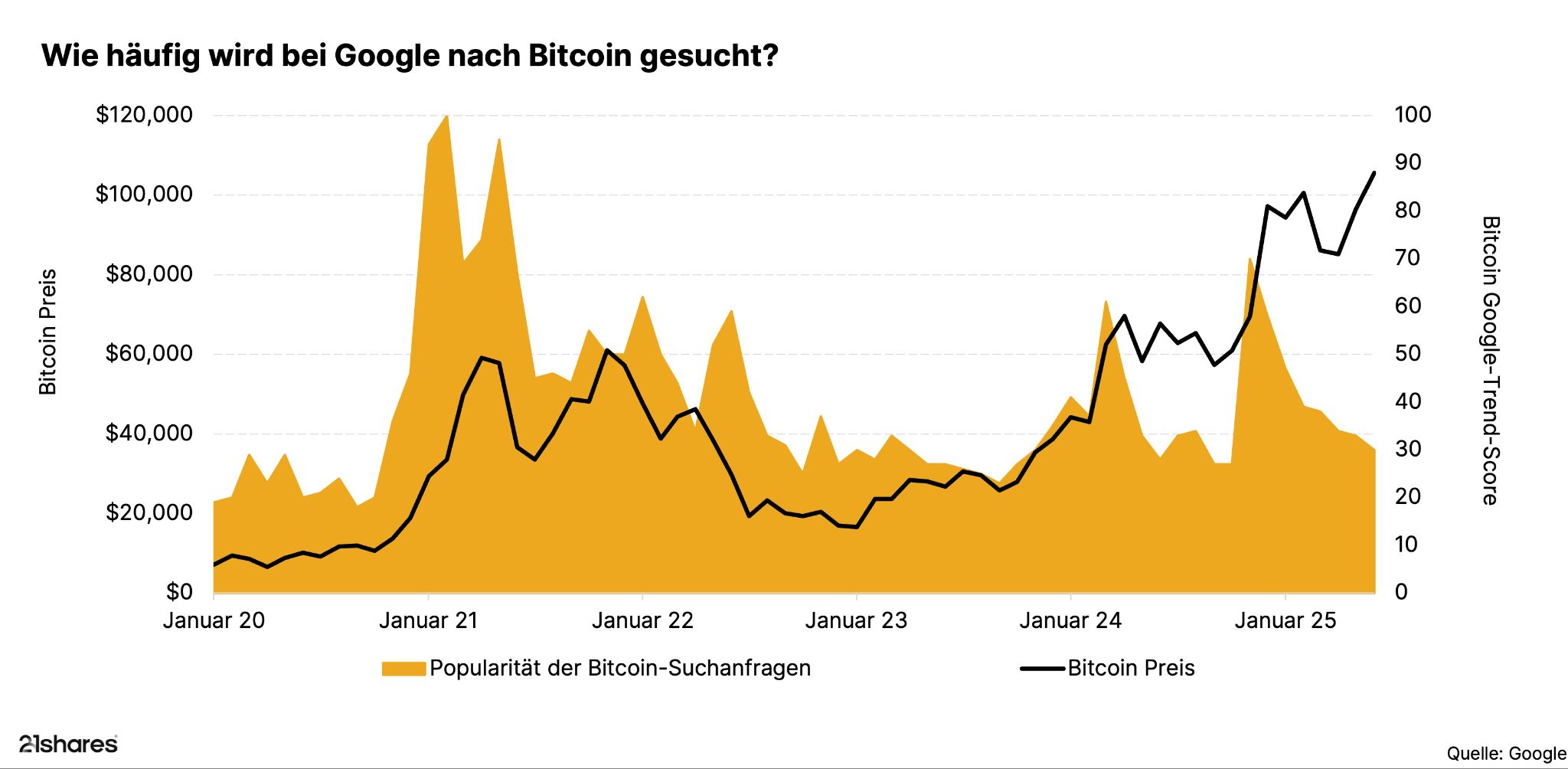 Während des Bullenmarktes 2021 erreichte das Suchinteresse für den Begriff „Bitcoin“ in den USA im Februar den Wert 100 und spiegelte damit die Spitze der privaten Nachfrage wider. Im Juni 2025 liegt dieser Wert lediglich bei 29. Das deutet darauf hin, dass die Begeisterung unter Privatanlegern noch ganz am Anfang steht. In den kommenden Monaten könnte daher noch viel Wachstumspotenzial vorhanden sein, wenn sich die Beteiligung zunehmend in Richtung jener Euphorie entwickelt, die typischerweise an Markthöhepunkten zu beobachten ist.
