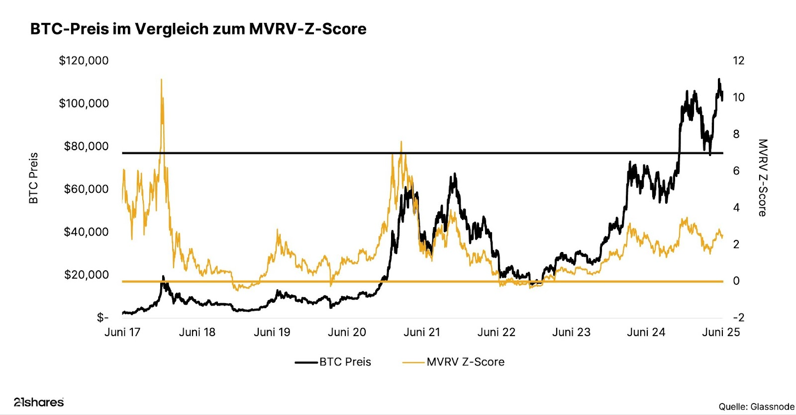 Historisch gesehen haben Werte über 7 auf Markttops hingedeutet. 2017 erreichte der Score 11, 2021 lag er ebenfalls über 7. Am 11. Juni 2025 lag der MVRV Z-Score bei 2,5, was als neutral gilt.