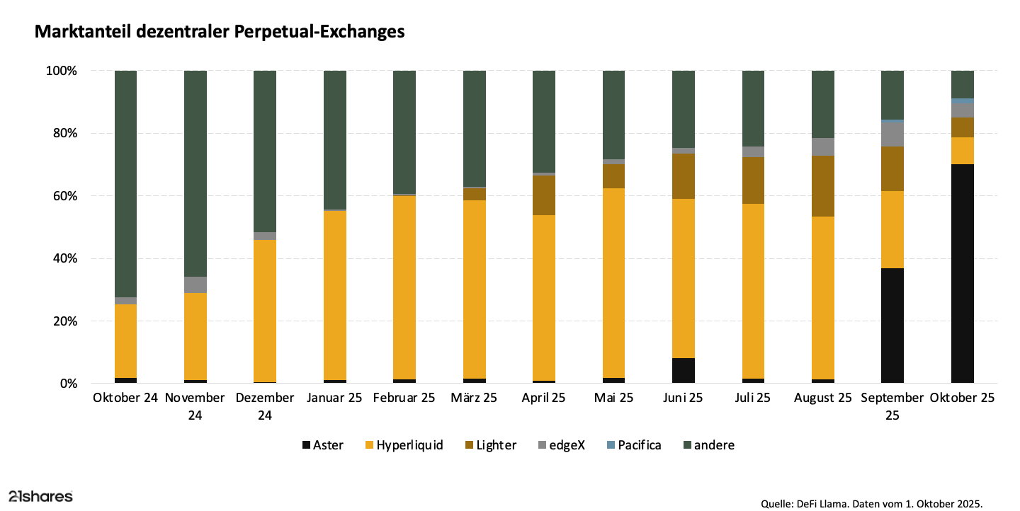 Im September 2025 kam es bei den Perpetual-DEXs zu einer deutlichen Verschiebung der Marktverhältnisse. Hyperliquids Marktanteil fiel auf etwa 10 Prozent, während Aster mit fast 70 Prozent klar dominierte. Lighter, das sich bis Anfang Oktober noch in einer geschlossenen Testphase befand und am 2. Oktober ins Mainnet startete, erreichte direkt rund 15 Prozent Marktanteil.