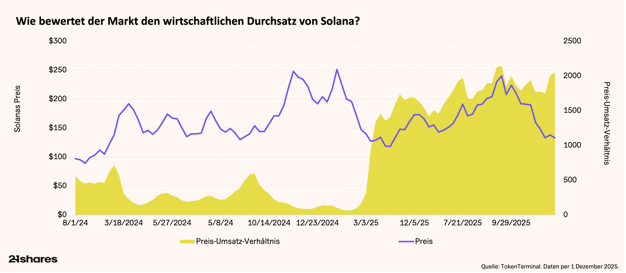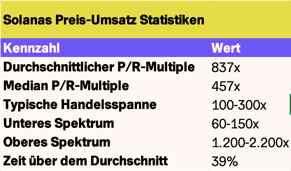 Sein P/R-Verhältnis reagiert stark auf die Nutzeraktivität, da die meisten Transaktionen direkt on-chain stattfinden. Fällt der Umsatz schneller als der Marktwert, steigt das Multiple, auch wenn der Preis stabil bleibt. In diesem Zyklus lag Solanas durchschnittliches P/R bei etwa 837x, mit Kontraktionen auf 60 - 150x, die attraktive Bewertungen signalisieren, und Spitzen über 1.200x, oft in überhitzten Märkten nahe 200 - 250 US-Dollar.