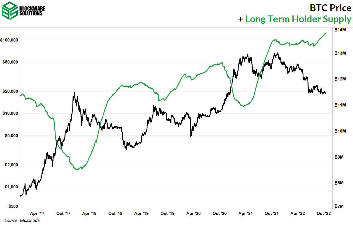 Abbildung 3: Bitcoin-Preis im Vergleich zum Bestand bei Langfrist-Haltern