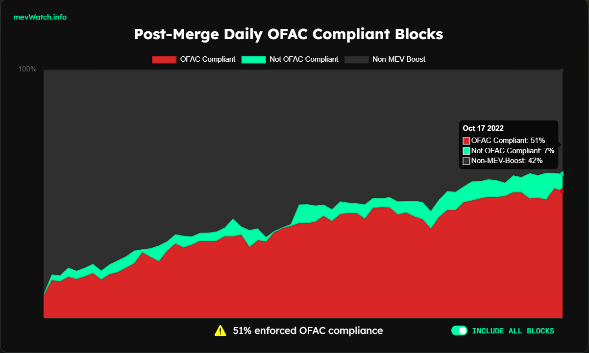 • Mehr als 50% der neu produzierten Ethereum-Blöcke sind jetzt OFAC-konform