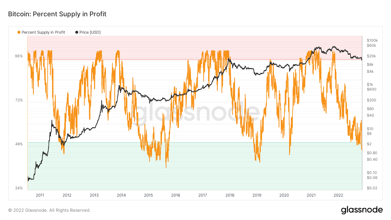 Figure 3 highlights the percentage of the current BTC circulating supply in profit. This metric represents an oscillator that allows us to understand the current state of the market better. Historically, values above 95% have coincided with market tops, while values below 50% have preceded past cycles' bottoms. On November 9, the BTC percent supply in profit reached 45.93%, the lowest level since March 2020.