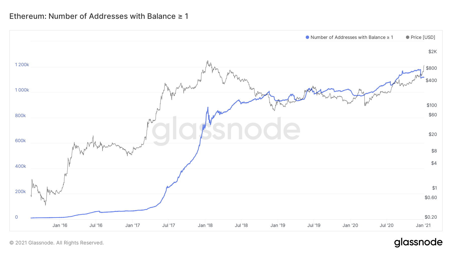In between the newfound role of Bitcoin as an institutional digital gold, as well as the notable innovation within Ethereum and the decentralized finance ecosystem, there are significant drivers of growth for the space within 2021. The chart below shows how the amount of addresses holding 1 ETH has consistently increased since the previous bull market of 2017, a signal that user interest in the platform and DeFi is on a constant upward trend.