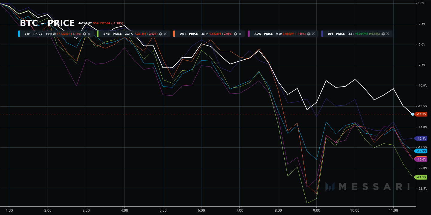 The most pressing question from investors within the Bitcoin and cryptoasset market over the last 24-hour period has been: what caused the recent downturn in markets? The chart below shows the performance of the five largest cryptoassets by market value and an index of DeFi tokens.