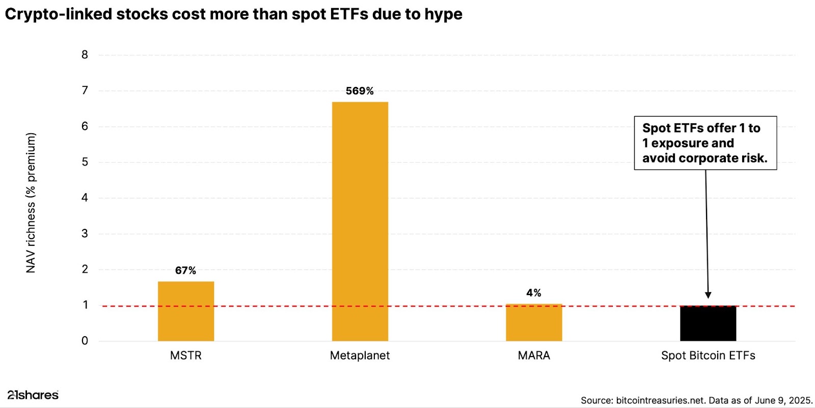 Gaining Bitcoin exposure through crypto-forward companies comes at a cost. These stocks often trade at significant premiums to the actual value of the Bitcoin they hold, premiums driven more by hype and momentum than by fundamentals.