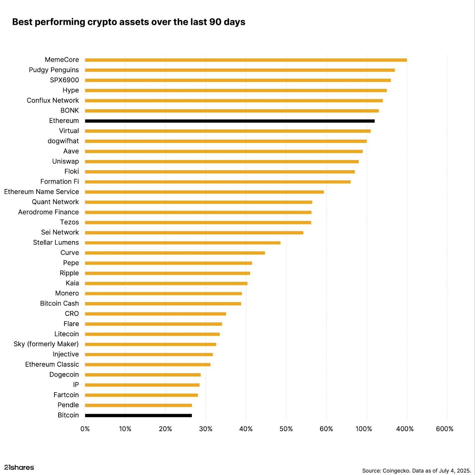 - Memecoins like Pudgy Penguins (PENGU) are leading the pack, jumping a massive 611% in the last 90 days. SPX6900 (SPX) is also up 285%.
