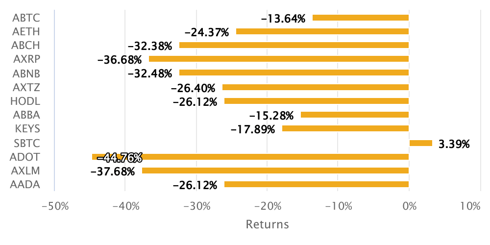 The performance of our line of ETPs over the last 30 days is as follows: ABTC (-13.64%), AETH (-24.37%), ABCH (-32.38%), AXRP (-36.68%), ABNB (-32.48%), AXTZ (-26.40%), HODL (-26.12%), ABBA (-15.28%), KEYS (-17.89%), SBTC (3.39%), ADOT (-44.76%), AXLM (-37.68%), AADA (-26.12%).
