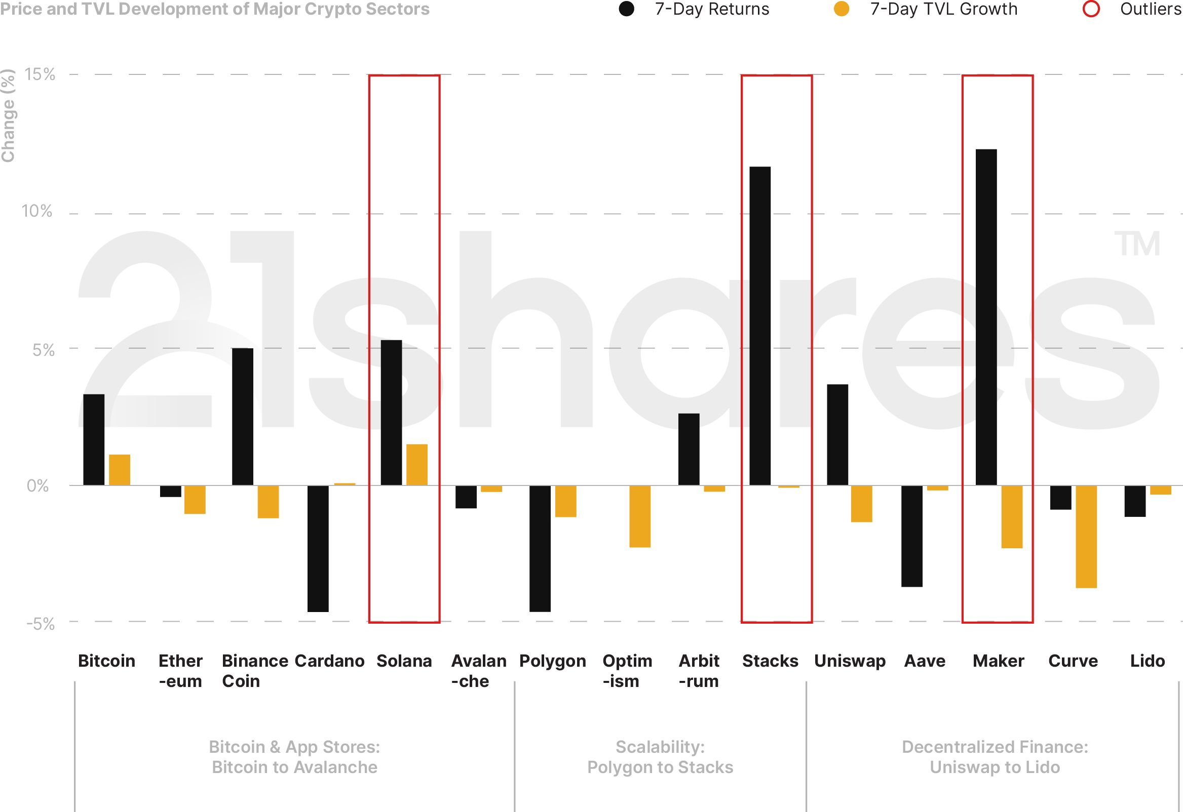 Markets are slowly recovering from the regulatory crackdown on Binance and Coinbase in the U.S. over the past few weeks. Bitcoin increased by 3%, while Ethereum fell by less than 0.5%. The performing settlement blockchains (Layer 1s) this week were Solana (+5.4%) and Binance Coin (+5%). As for the realm of scaling solutions (Layer 2s), Bitcoin’s scalability solution Stacks soared by almost 12%. In DeFi, MakerDAO, behind the largest decentralized stablecoin, DAI; came in as last week’s biggest winner, with a week-over-week performance of 12.4%. This jump can be attributed to the DAO’s consensus to increase DAI savings rate from 1% to 3.94%, as part of its broader roadmap which includes reshuffling the backing assets of its stablecoin.
