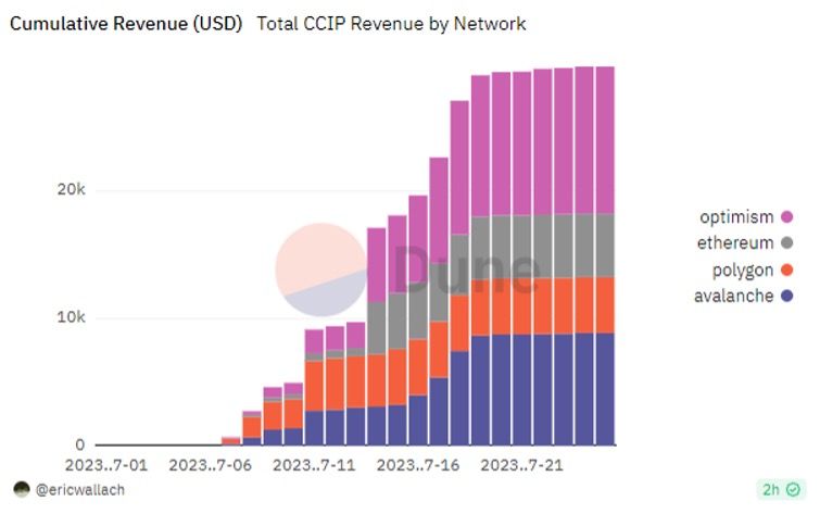 With a fee-based revenue model in place, the protocol can now grow sustainable earnings for the nodes participating in Chainlink’s Decentralized Oracle of Networks (DONs), which are the security backbone of all of Chainlink’s services. That said, although Chainlink accrued only $30K in fees over the first few days due to the limited partners at launch, with only Synthetic and Aave employing CCIP for transferring tokens and cross-chain governance, we could see substantial growth as Chainlink expands its partner network. The integration with SWIFT further solidifies CCIP’s potential as the go-to solution for cross-chain interoperability for crypto and traditional players, eventually allowing connectivity between both financial systems.