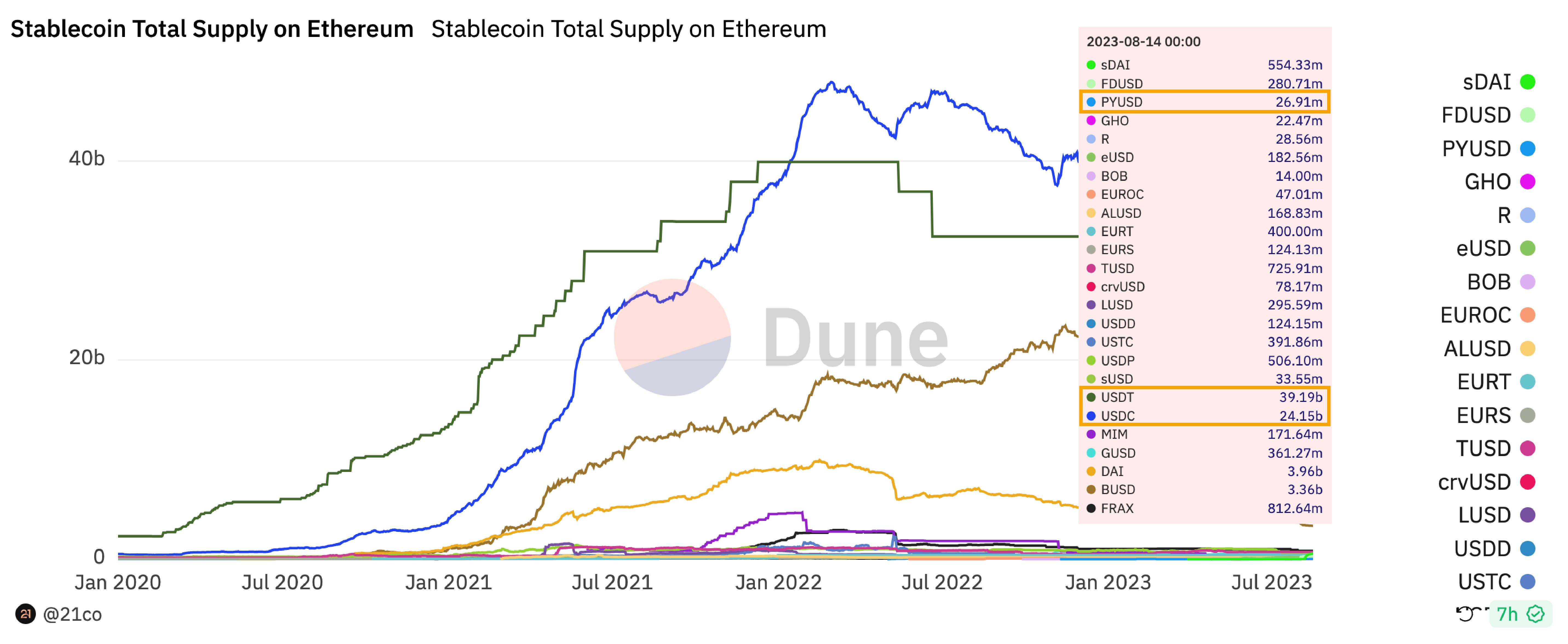 - As traditional players begin entering the stablecoin market, the Federal Reserve Board (FRB) announced a program to supervise the “novel activities” the banks under its jurisdiction are carrying out. The FRB has also provided guidance on the process a state bank needs to follow before engaging in stablecoin activities. State banks will require a written supervisory non-objection from the FRB before issuing, holding, or transacting in stablecoins. This comes a day after PayPal announced its launch of a fully-backed, dollar-pegged stablecoin, PYUSD, with Paxos, built on Ethereum, with zero transaction fees. PayPal expects its PYUSD to be used primarily in decentralized finance and remittances, leveraging its position as a leader in the online payments market with a 40.52% market share. While it’s still too early to tell whether PayPal’s venture into crypto will level up to its success in traditional finance, steady progress should be guaranteed, given the company’s regulatory and adoption advantages.