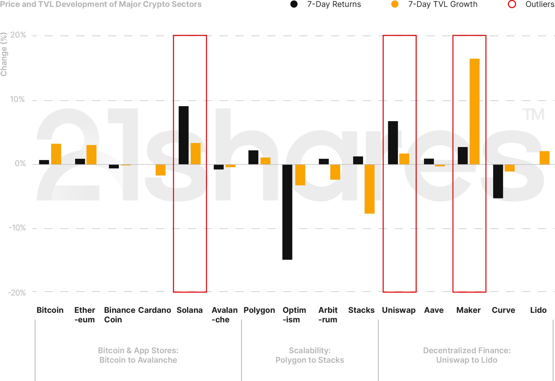 Figure 1: Weekly Price and TVL Developments of Cryptoassets in Major Sectors