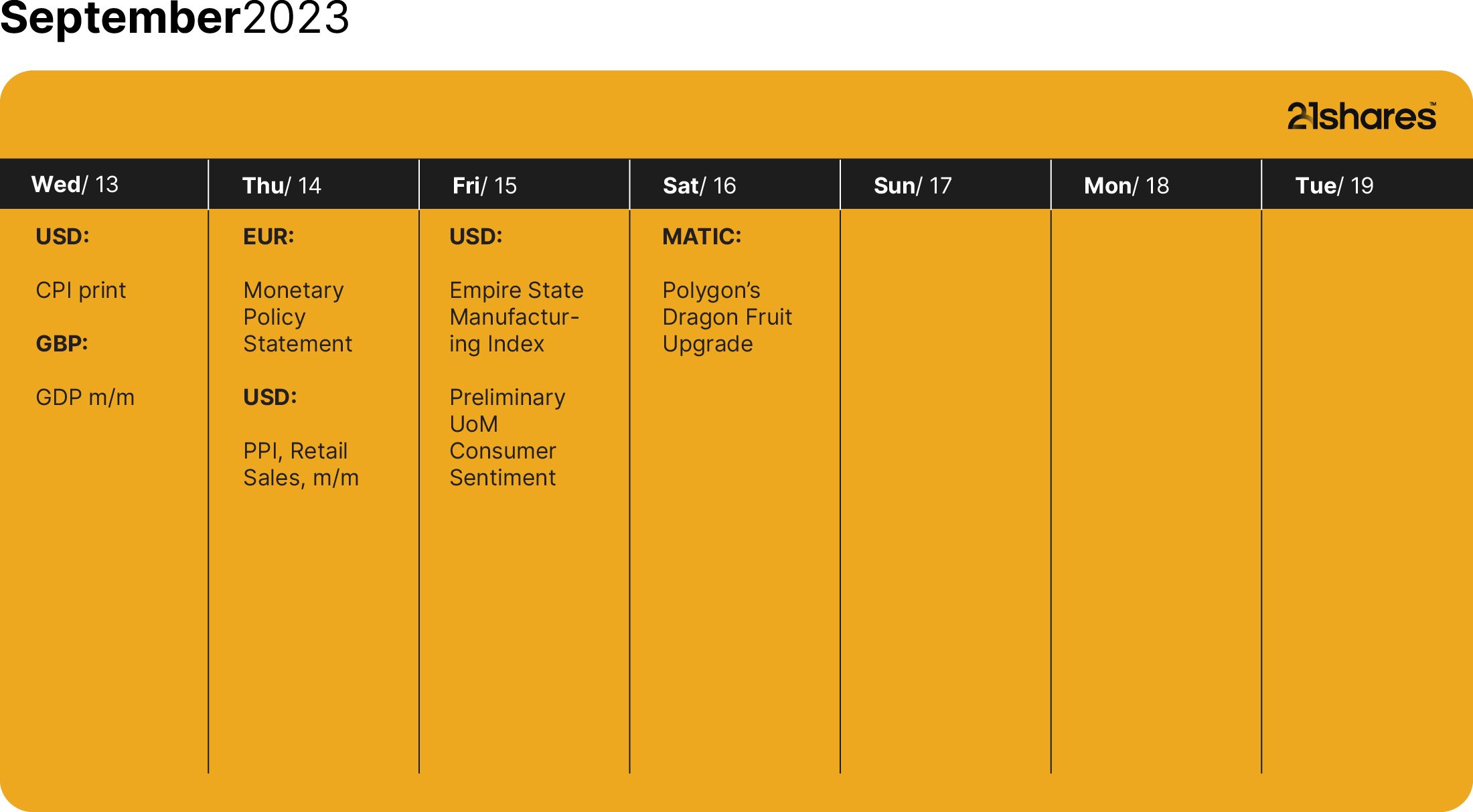 Source: 21Shares, ForexFactory, Coinmarketcal.