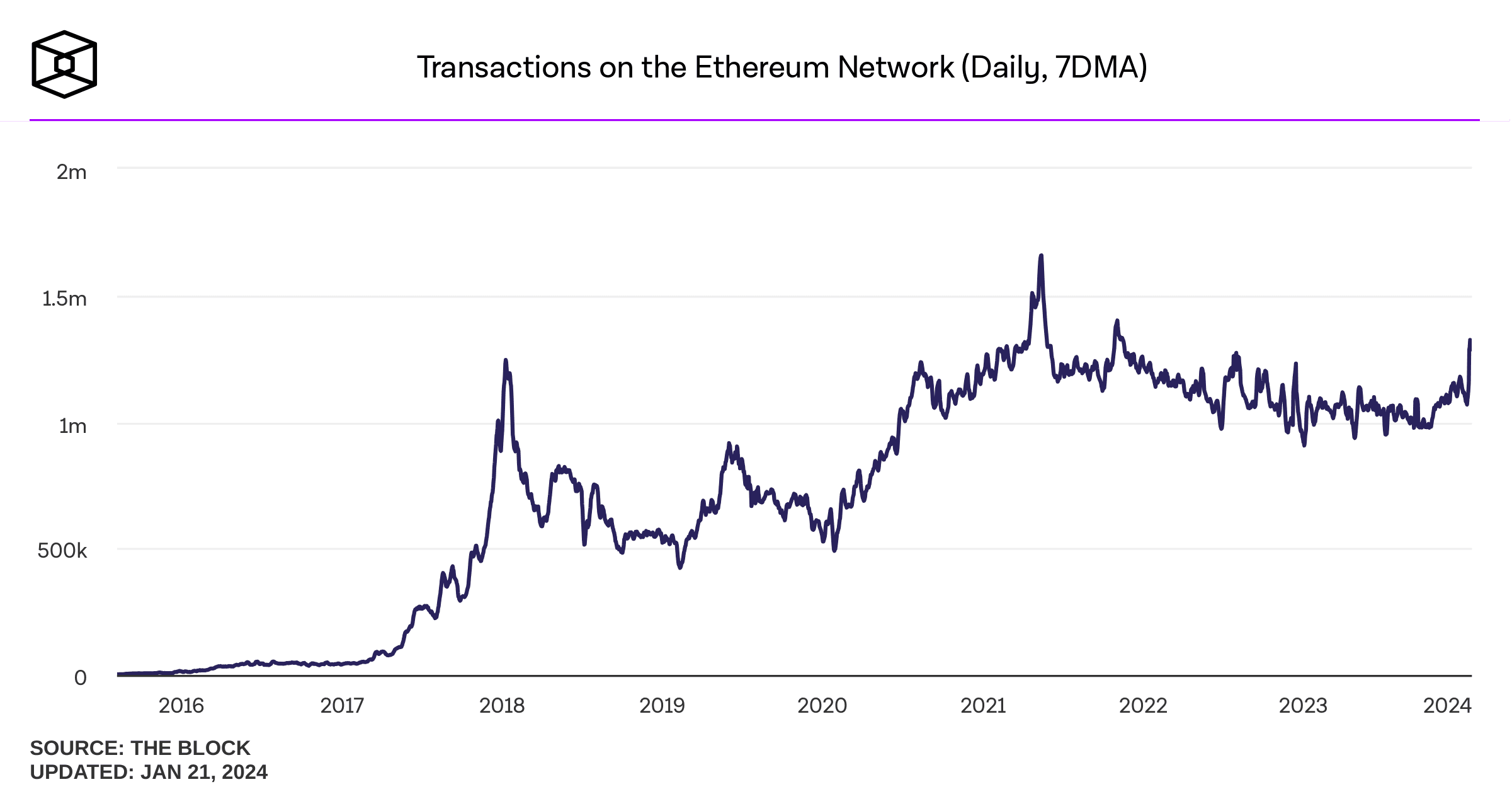 With the successful completion of the current upgrade, the path is now paved for two additional trial runs on January 30 and February 7, leading to the expected mainnet deployment in late March. This upgrade is pivotal, standing out as a key driver of excitement around Ethereum and its extensive ecosystem of scaling solutions, as evidenced by the network's surging daily transactions reaching a multi-year high (see Figure 3). The upgrade, combined with speculating the approval of a Spot Ethereum ETF in the U.S. and its potential impact on ETH’s performance, is poised to generate momentum for the second-largest cryptocurrency by market cap, solidifying its market position.