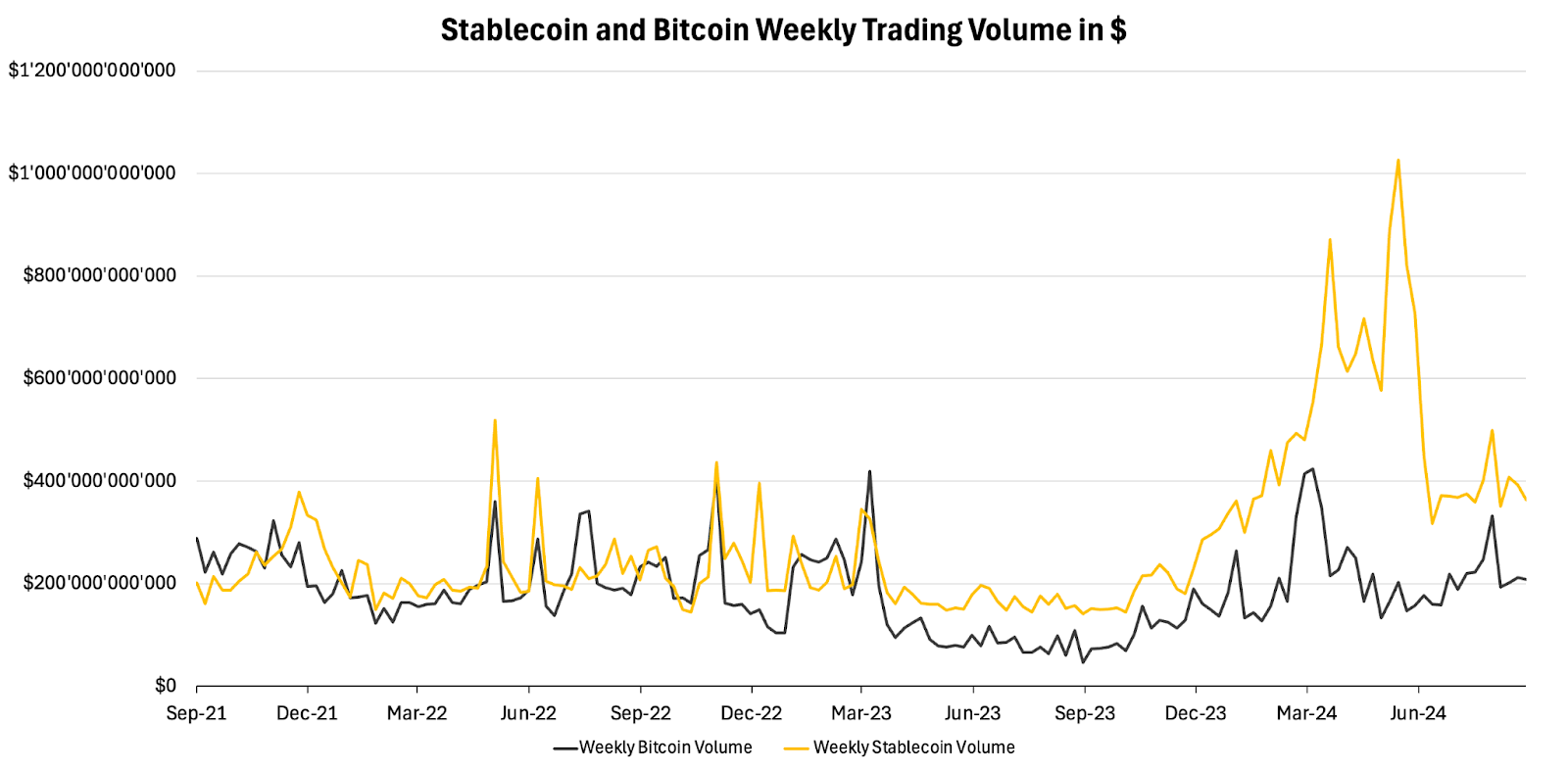 Figure 4 – Weekly Volume of Stablecoins and Bitcoin (USD)