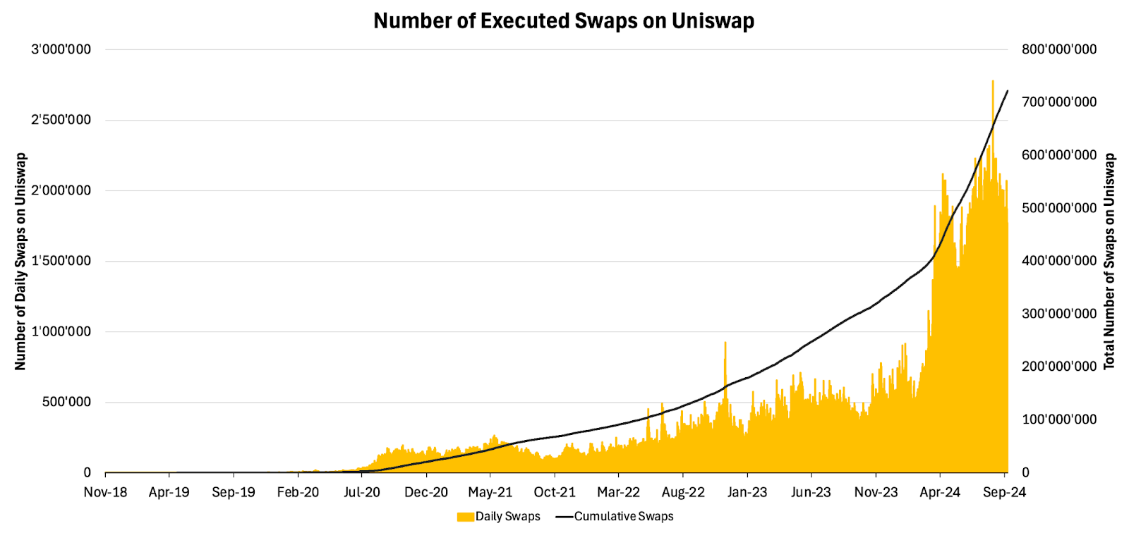 Figure 3 – Total number of swaps/traded executed via the different iterations of Uniswap