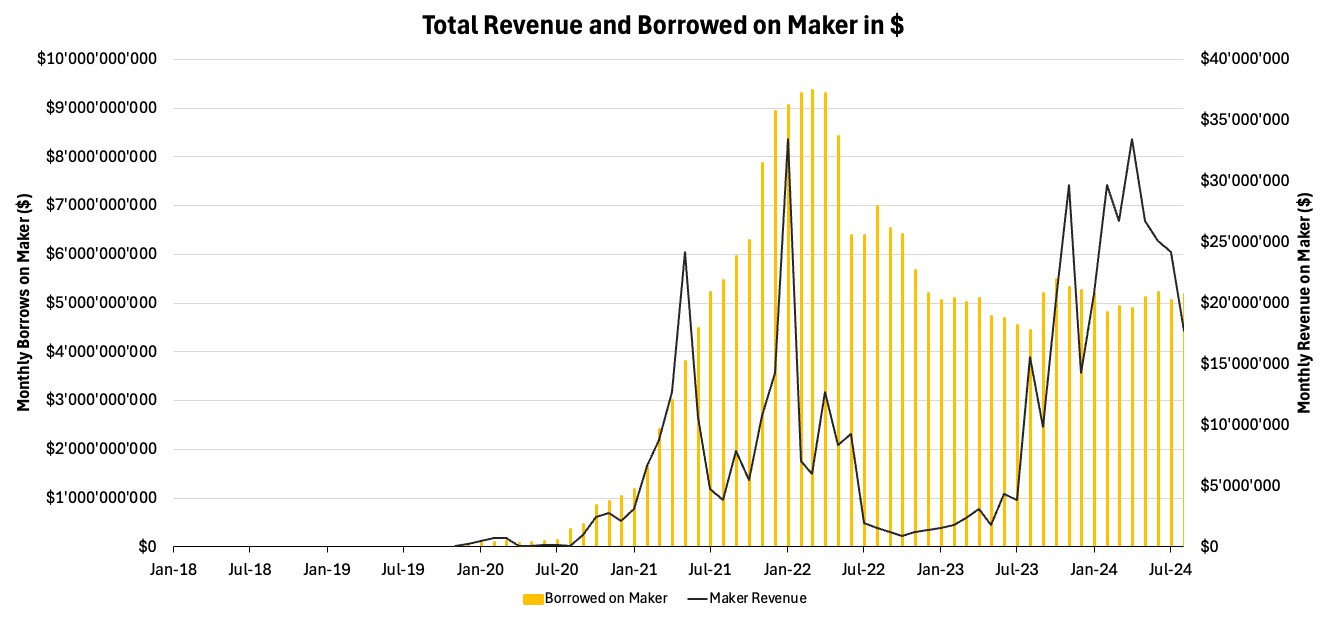 While Q3 2024 revenue is projected to fall slightly below Q2’s $85M peak, it is still on track to more than double the $33M from Q3 2023. This impressive year-over-year growth highlights Maker’s ability to generate consistent earnings despite varying market conditions.