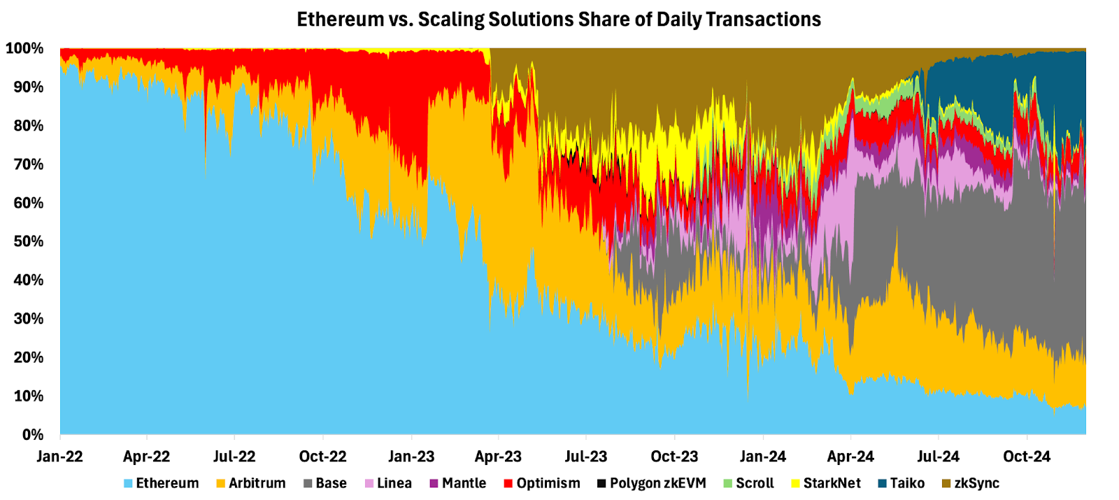 On the regulatory front, significant changes are looming for Ethereum. Gary Gensler’s imminent departure from the SEC, combined with potential policy shifts under President-elect Trump’s administration, could bring about a dramatic transformation in the regulatory landscape for cryptocurrencies. Ethereum is uniquely positioned to benefit from this transition, given its status as the dominant DeFi ecosystem, however, as shown in Figure 4, its TVL of $70B is under threat by the L2 networks atop.