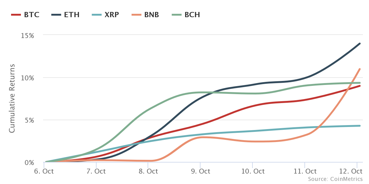 The entire market experienced a resurgence over the last week following its poor performance over the month of September — BTC (8.98%), ETH (13.99%), XRP (4.27%), BNB (10.97%), and BCH (9.34%).