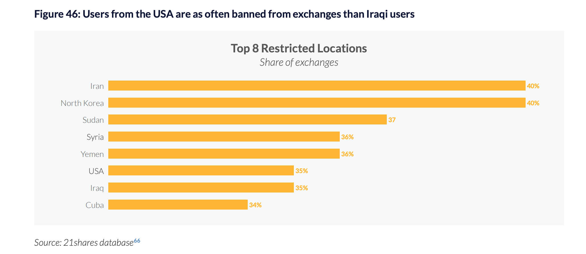 Despite the growing demand for cryptoassets accounting for more than 100 million users — the stage we are, at the moment, is similar to the Internet adoption in the late 1990s. Our research team discovered that market participants across the world face restrictions imposed by crypto exchanges due to regulatory concerns. The repercussions from regulatory bodies such as the recent crackdown on BitMEX by the CFTC alongside the FCA's ban on crypto derivatives are clear examples as to why such impositions exist. And a result, such restrictions might persist going forward — especially in light of the recent publication by the Department of Justice of the United States outlining an enforcement framework to combat the potential use of cryptoasset for illicit ends and another piece raising concerns on privacy-enhanced techniques. However, regulatory clarity and harmonization enable service providers, including in the DeFi segment, to understand the scope in which they can serve users based upon their geographic location. As a matter of fact, according to CCAF, the share of cryptoasset-only companies that did not conduct any KYC checks at all dropped from 48% to 13% between 2018 and 2020.