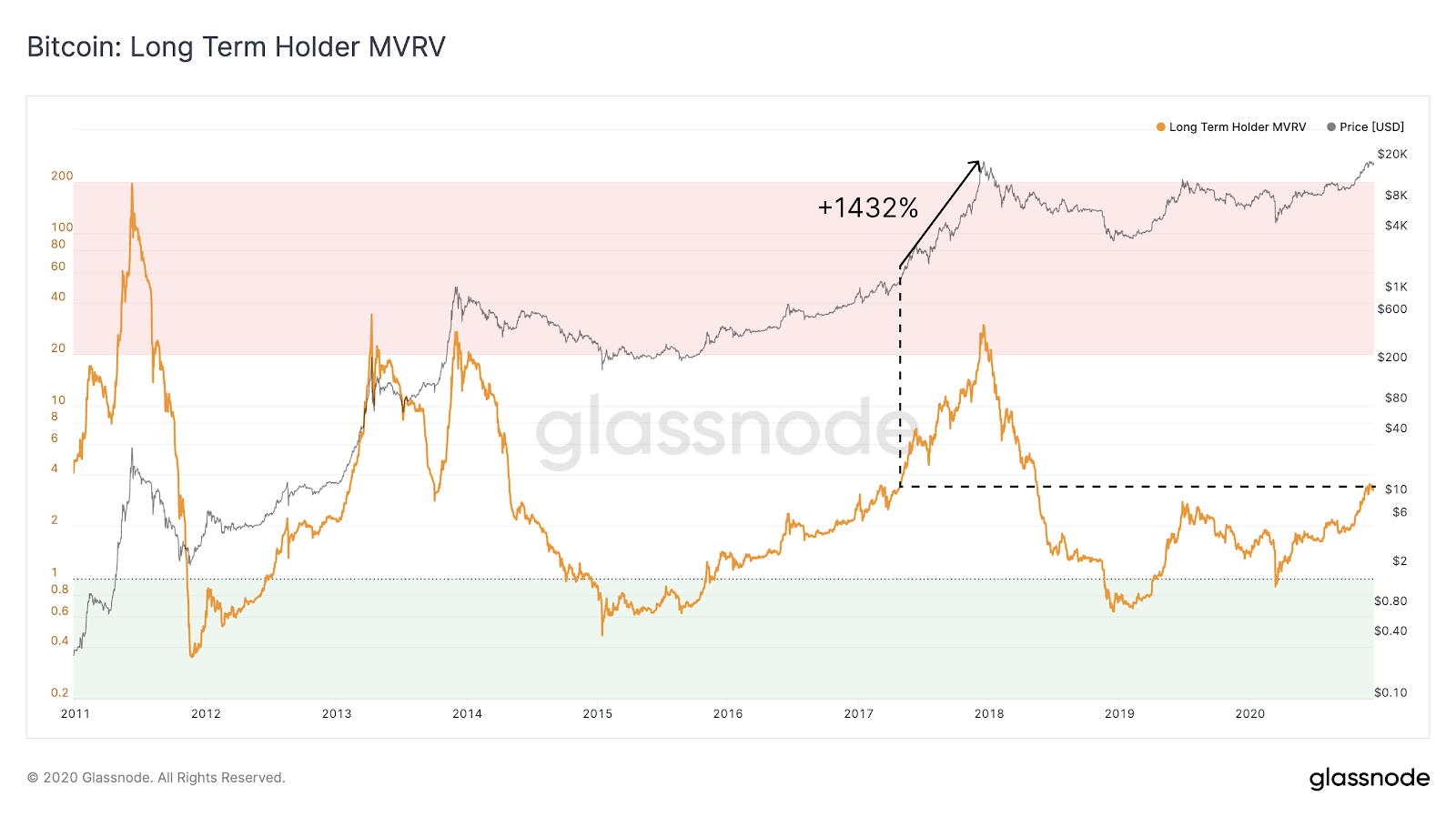 When LTH-MVRV reaches the red zone (above 20), this generally indicates a global top — the last time it reached above 20 was in December 2017 during the ICO bubble. But as we can see in the chart below, bitcoin's LTH-MVRV is still very far from the red zone.