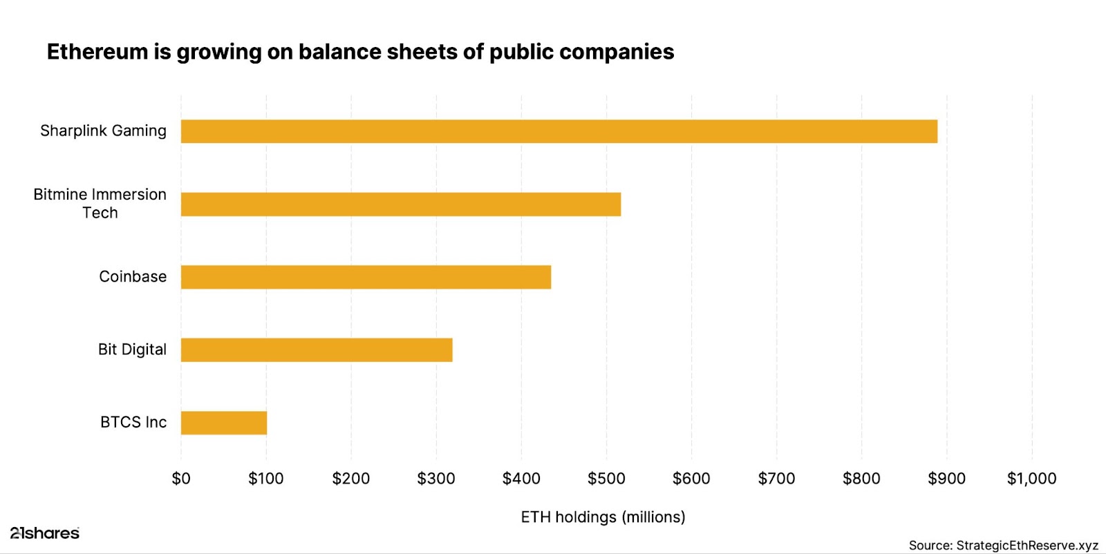 But the appetite for Ethereum goes beyond just passive investments. A growing number of corporate treasuries are now allocating substantial amounts to ETH directly to their balance sheets. Names such as Sharplink Gaming, led by Ethereum co-founder Joe Lubin, and former Bitcoin miner Bitmine, led by a former Chief Equity Strategist at JP Morgan (and tradfi legend), are leading this charge, adding hundreds of millions in ETH. This shift signifies a broader strategic embrace of Ethereum not merely as a digital commodity, but as a programmable yield source and an essential component of the next-gen financial ecosystem.