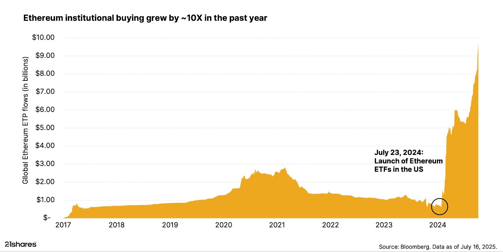 As we mark one year of Ethereum ETPs in the US, their market fit is undeniable. If current trends persist, July 2024 may come to be seen as a meaningful turning point in how the market values Ethereum - not just as a high-growth technology asset, but as a foundational layer of the future of finance.