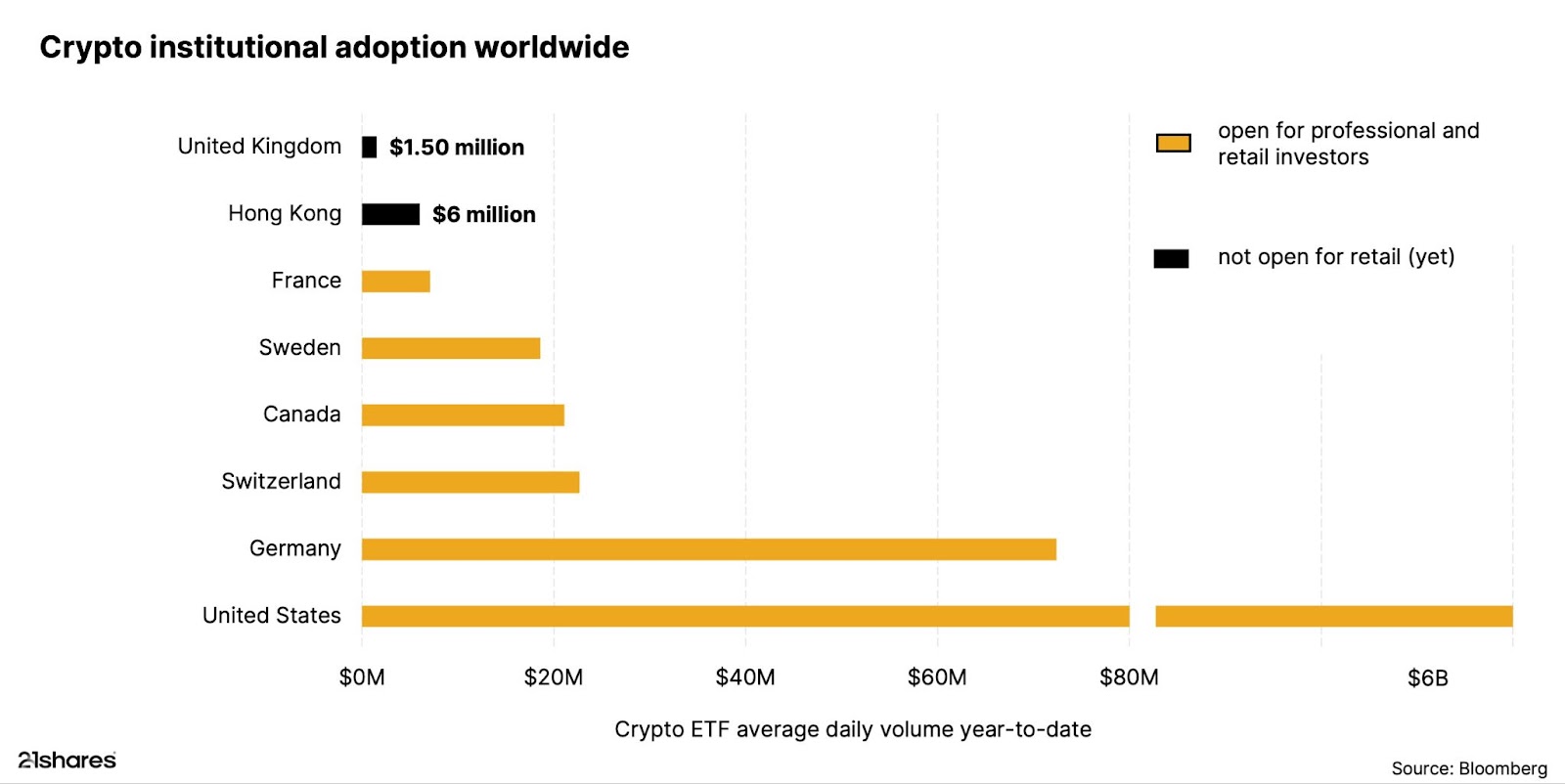 Returning to the global race for crypto ETP dominance, the US leads the pack, with institutional investors trading a daily average of over $6 billion in Bitcoin and Ethereum ETFs this year. The EU follows, averaging more than $100 million in average daily volume across multiple jurisdictions. The UK, however, remains well behind, with just $1.5 million in average daily volume for crypto ETNs, currently limited to professional investors.