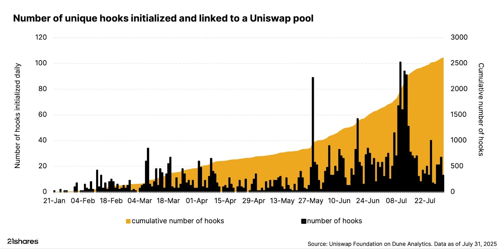 2. Hooks: Uniswap v4 introduces something called Hooks, special pieces of code that let developers customize how trading works on the platform. In July alone, over 100 new Hooks were added each day, showing that developers are really excited and actively experimenting with what’s possible.