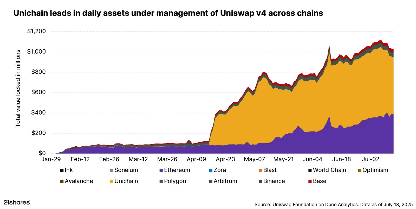 1. Unichain: Unichain is an Ethereum layer two blockchain (a secondary system built on top of a main blockchain that helps make transactions faster and cheaper) built for Uniswap. This new chain has already overtaken Ethereum in terms of Uniswap v4 transaction volume, now accounting for nearly 50% of v4 activity.