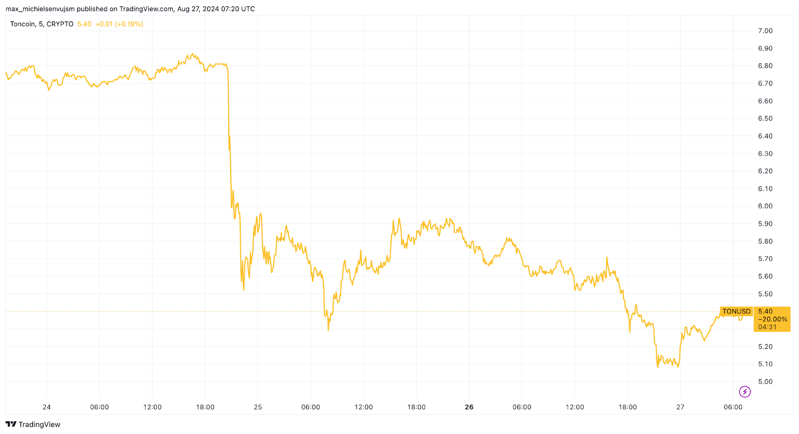 Pavel Durov, the founder of the popular encrypted messaging app Telegram, was arrested on August 24 in Paris as part of preliminary investigations into the platform’s alleged role in facilitating 12 criminal violations. In response, The Open Network’s (TON) native token, Toncoin, plummeted by 25% since the arrest to a low of $5.11 in fear of what the escalation of this investigation may bring.Figure 1 – TON Weekend Price Performance