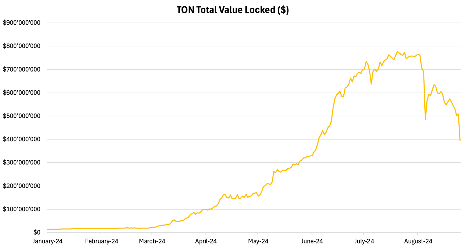 Source: TradingViewThis is mirrored in the tremendous growth in Total Value Locked (TVL), a crypto-proxy for assets under management, which started the year at a mere $13.5M and reached a peak of $776M on July 20 this year.Figure 4: TON Total Value Locked