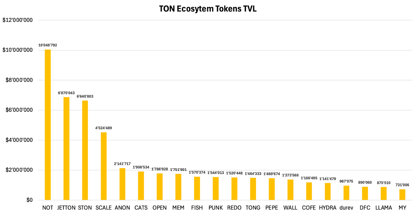 Source: Artemis, 21SharesWhile TVL is currently down to around $400M, this is still up 2820% this year, and the current retracement is largely due to the aforementioned price hit TON recently took.A significant portion of TON’s TVL is concentrated in its DeFi sector, particularly in liquid staking. Tonstakers boast the highest liquid staking rate across all chains, signaling strong user engagement in TON’s DeFi ecosystem. This high participation rate not only highlights the attractiveness of TON's DeFi applications but also underscores the growing confidence and interest in the platform’s potential for generating yield. Beyond FinanceHowever, TON is not just about DeFi. Looking beyond this sector, TON’s ecosystem of Mini Apps has a TVL of approximately $69M, with the top 20 boasting $50M. Figure 5: Total Value Locked across Telegram Mini App Ecosystem