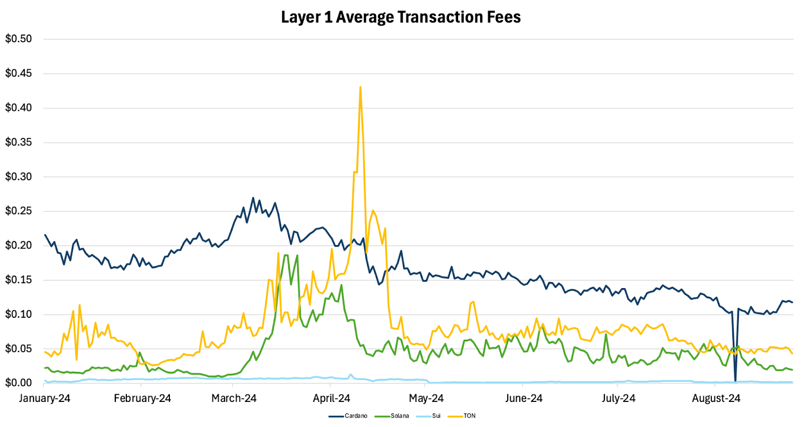 Source: Artemis, 21SharesDespite TON’s explosive growth this year, it demonstrated remarkable scalability. While comparable networks struggle with rising fees as adoption increases, TON maintained an average transaction cost below $0.10. This stands in contrast to networks like Cardano, which routinely maintained higher fees despite significantly less adoption and fewer applications. Even when activity surged, it reached just shy of $0.45. While that is more expensive than the leanest blockchains like Sui and Solana, it’s important to remember that TON’s main opportunities lie in onboarding a host of new crypto entrants from Web2. These entities prioritize a user-friendly and familiar process, which TON offers, as opposed to a mere $0.05 cheaper transaction costs. Figure 9: Comparison of Transaction Fees Between L1s