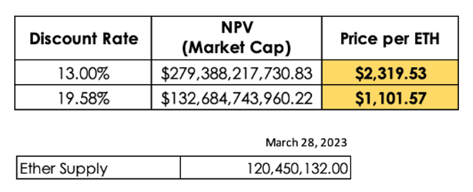 • Results: Assuming a discount rate of 13%, the implied price per one ETH today would be ~$2,320, a 31% increase from ETH’s price ($1,776) as of March 28. On the other hand, if we use a 19.58% discount rate, the implied price per one ETH would be **$1,102**. Investors should interpret the results of this DCF valuation with caution and run their own assumptions regarding projected cash flows and discount rates. The rationale behind our approach was to be conservative and capture the high volatility of ETH in the discount rate to reflect the asset’s riskiness accurately. Another implicit assumption of this approach is that the asset’s monetary premium (Store of Value) is embedded into the DCF.