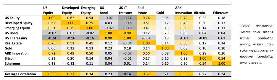 • Bitcoin’s correlation with major asset classes ranges from -0.01 to 0.28 (excluding Ethereum), a similar level to what Gold (GLD) offers ranging from 0.06 to 0.23. This level of correlation made both assets a vital diversification source for traditional portfolios, which are a mix of equities and bonds. However, there is almost no correlation (0.10) between Gold and bitcoin, making both unique diversification resources for investors’ portfolios.