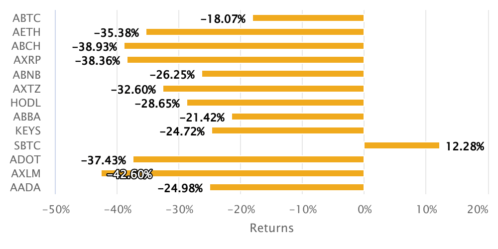 The performance of our line of ETPs over the last 30 days is as follows: ABTC (-18.07%), AETH (-35.38%), ABCH (-38.93%), AXRP (-38.36%), ABNB (-26.25%), AXTZ (-32.60%), HODL (-28.65%), ABBA (-21.42%), KEYS (-24.72%), SBTC (12.28%), ADOT (-37.43%), AXLM (-42.60%), AADA (-24.98%).